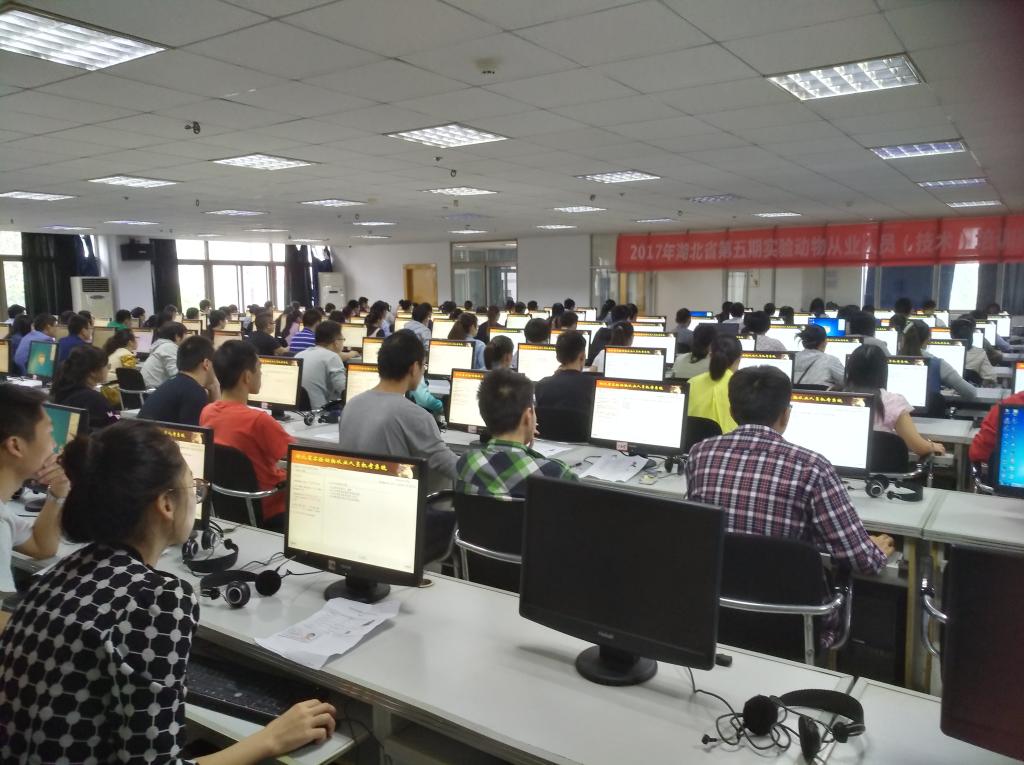 9月30日,2017年湖北省第五期实验动物从业人员(技术)资格考试在同济医学院如期进行。为了增强考试的严肃性、公正性,面对这么庞大的报名人数,培训基地特邀湖北实验动物学会资深专家安学芳高级兽医师、杨文祥高级兽医师、王利霞博士、张金明高级兽医师、周顺长高级工程师、李安意主管技师、于东、赵要武、许迪、叶明霞、罗杰、方爱国等工程师组成动物实验操作考核小组。本期共有594人参加理论考试,理论考试通过人数为422人,535人参加操作考试,操作考试通过人数为506人,考试包括计算机理论考试和动物实验基本操作考试,理论机考及技术操作考试两项通过者411人,通过率为69%,两项考试科目均通过的考生获得了湖北省实验动物从业人员(技术)资格证书。
